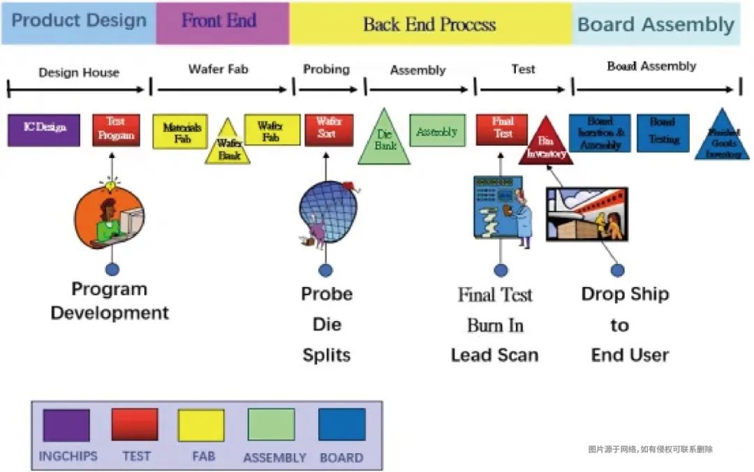 芯片的制作过程繁琐且难度极大。一颗芯片的完成,一般需要经过芯片设计、晶圆制造、晶圆测试、封装、成品测试、板级封装等诸多环节。芯片制作的整个过程都需要在洁净车间进行,为确保芯片的优秀性能,每个过程都需要严格控制。